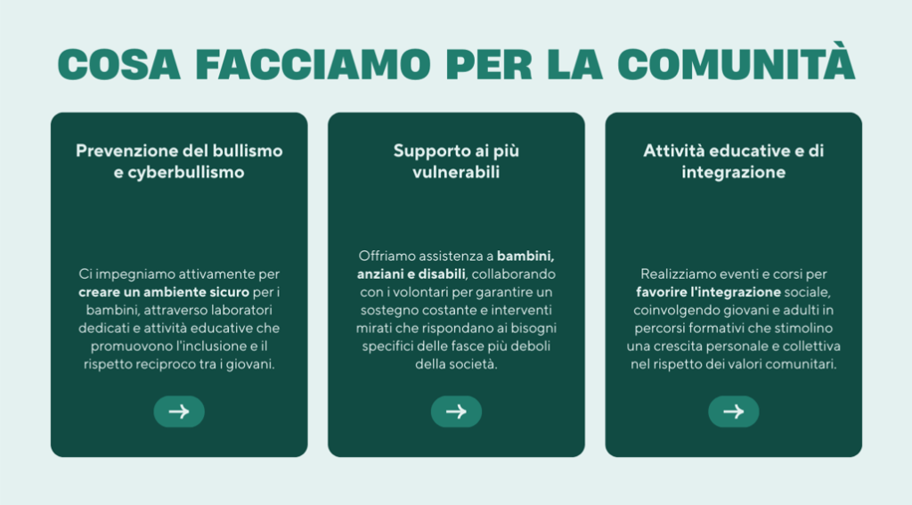 I nostri volontari e giovani partecipanti lavorano con passione per offrire supporto e opportunità a bambini e ragazzi in difficoltà, affrontando insieme le sfide del bullismo e del cyberbullismo. Grazie al lavoro di squadra e alla dedizione, creiamo un ambiente sicuro e accogliente, dove ognuno può prosperare.